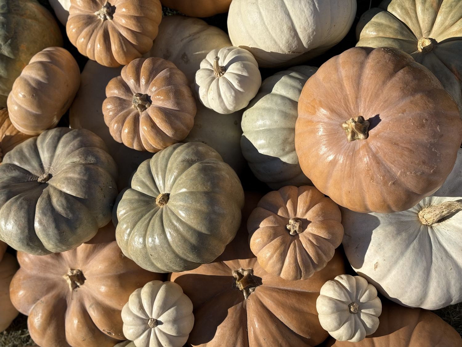Bold oranges, reds, and greens, mixed with whites, and pastel oranges and greens