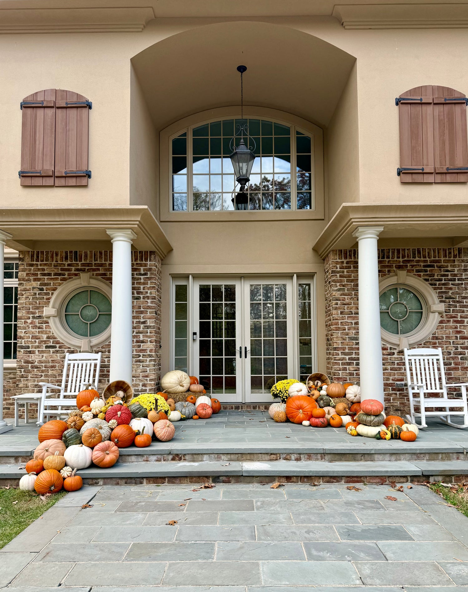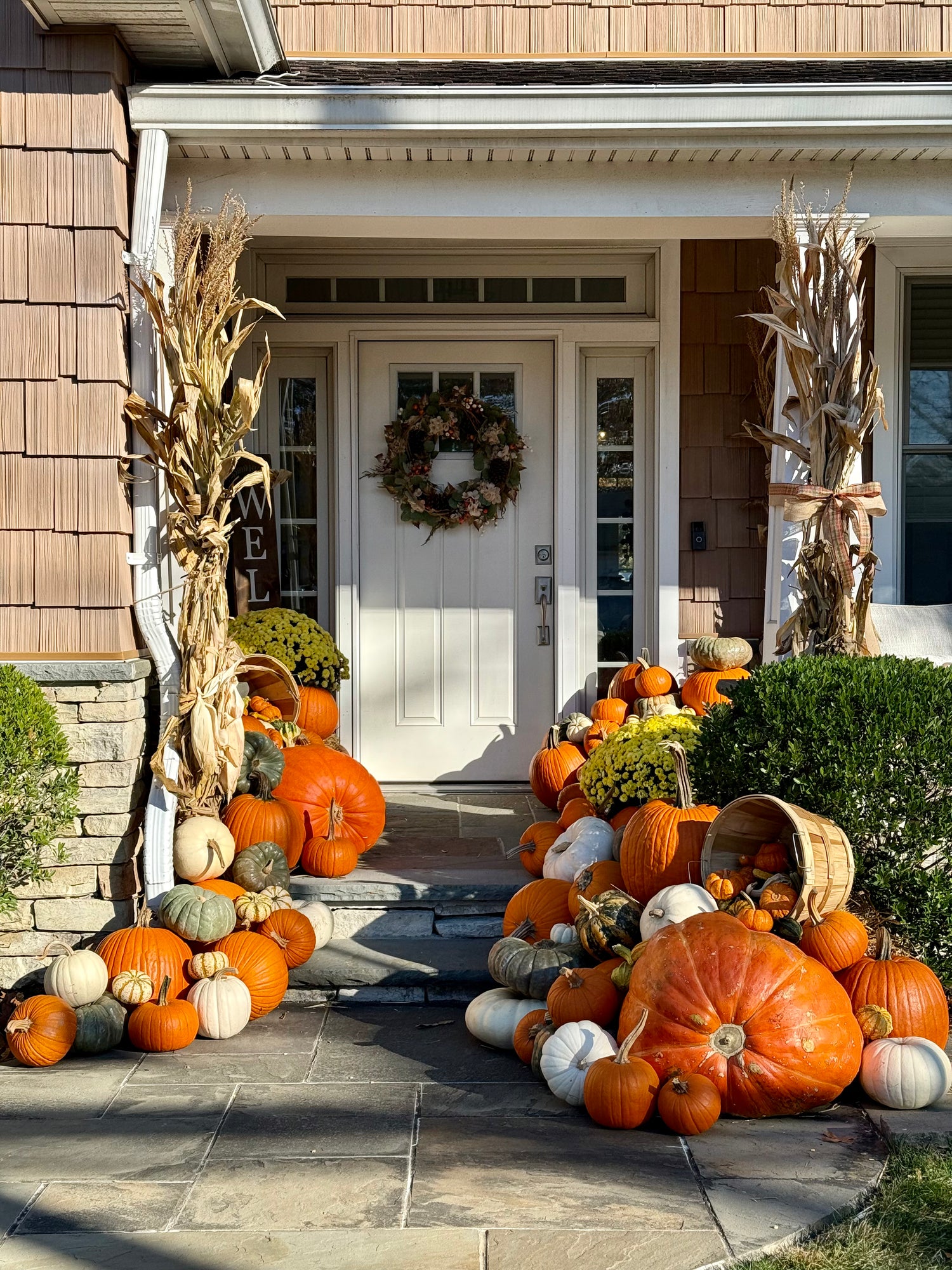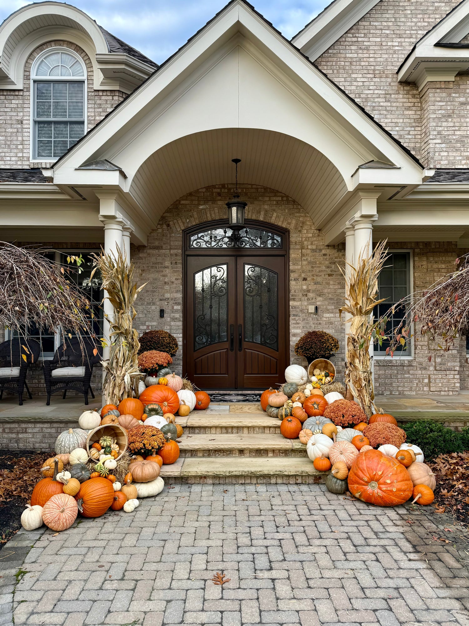 This is a Signature palette. She added yellow mums and four cornstalks along her porch.