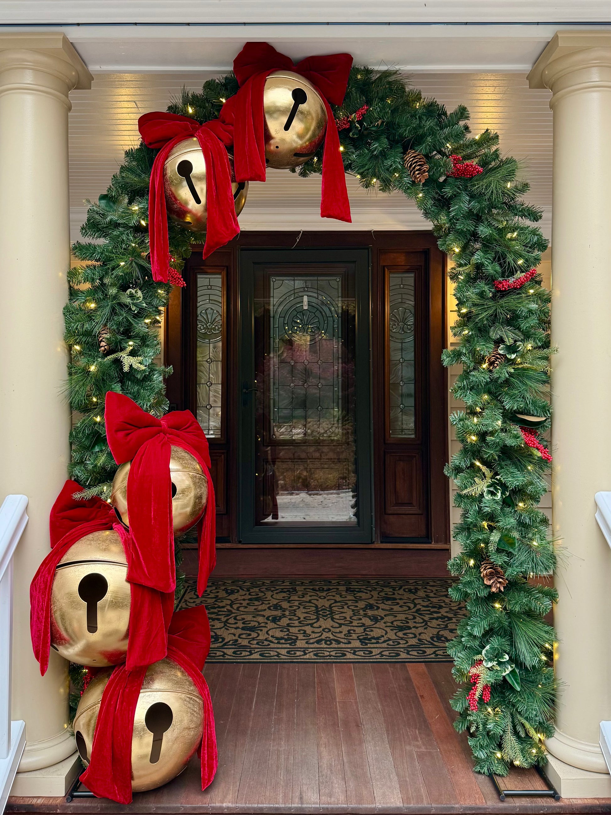 Includes two large bells (16" diameter) and three medium bells (12" diameter) topped with red velvet hanging bows. 140 warm white LED lights.